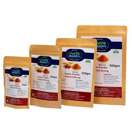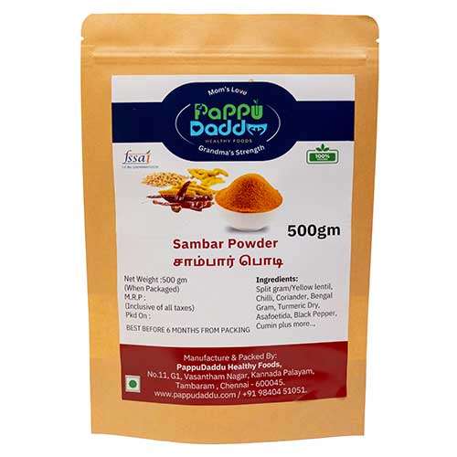 Authentic South Indian taste with PappuDaddu Sambar Powder! 100% natural, stone-ground, hand-roasted spices. Homemade healthy foods, no preservatives. Rich, bold flavor for sambar, dal, curries. Add 1-2 tbsp for traditional aroma. Pure & natural goodness!